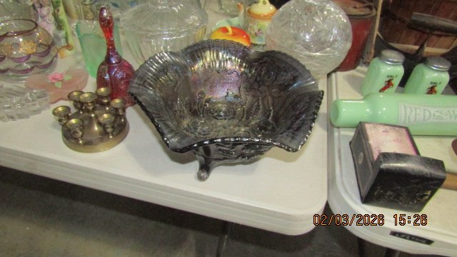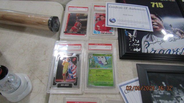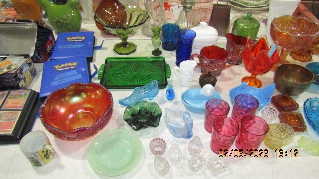 Pocketknives; Lots of Sports Cards – Big Collection; Pokeman Cards; Sports Memorabilia; Sports Autographs; Jerseys; Glassware; Paperweights; Green Depression Syrup; Fenton glass; Drexel Mahogany Bedroom Set w/ Headboard, Dresser, Mirror & 2 Nightstands; Corner Curio Cabinets; Bookcases; Mahogany Secretary Desk; Electric Free Standing Fireplace w/ Heater; Mahogany Secretary w/ Bookcase Top; Sligh Cherry Grandfather Clock; 3 Drawer Chest; Walnut Wash stand; 2 Cherry Knob Creek Drop Leaf Side Tables; Cherry Knob Creek 5 Piece Bedroom Set w/ Queen Size Bed, Dresser, Mirror, Chest & 2 Nightstands; Red Sleeper Sofa – Like New; 2 Cherry Corner Chairs; Walnut Drop Leaf Table & 4 Chairs; Maple Cane Bottom Highchair; Cherry Corner Curio Cabinet; White Lighted Curio Cabinet; Dinette Set w/ 4 Chairs; Lexington 8 pc. Dining Room Set w/ Table, 6 Chairs & Large Breakfront; Bassett 8 Drawer Dresser w/ Mirror; Lexington 9 Drawer Dresser w/ Mirror; Queen Size Mattress w/ Box Springs – Like New; Light Colored Sofa – Like New; White Sofa & Chair; Loveseat; 3 pc. King Size Bedroom Set; 4 Rattan Bar Stools; 2 Light Blue Living Room Chairs; Ornate Tilt Top Table; Jewelry Armoire; Large Set of Lenox China; Crystal Stemware; Wheeling China pcs; Dresser Set; Large Set of Pfaltzgraff China; Area Rugs; Linens; Lamps; Pyrex Bowls; Cast Iron Door Stop; Lots of Silver & Silver Plate; Pink Sanibel Cornucopia; Murano Glass Clown; Chicken Figurines; Hummels; Miniature Oil Lamps; Eagle Figurine; Advertising Tins; Oil Lamps; Graniteware; Metal Blade Fan; Kraut cutter; Child’s Saddle; Western Pictures; Race & Muscle Stickers; Lots of Antiques, Collectibles & Household Not Listed.