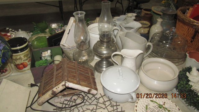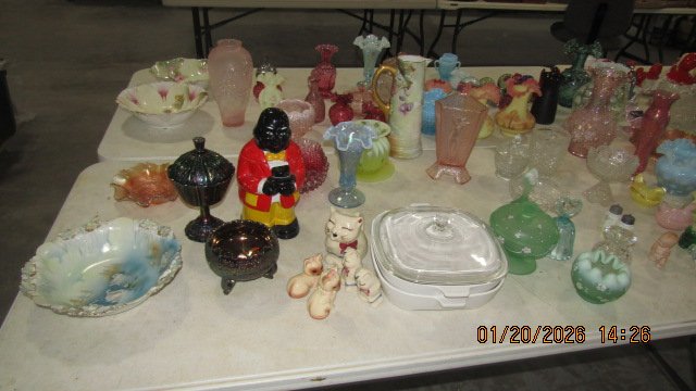 ANTIQUES, COLLECTIBLES, GLASSWARE, BOYD GLASSWARE; COVERED ANIMALS, TOOTHPICK HOLDERS, 25+ PIECES FENTON, TOY TRACTORS, JIM SHORE FIGURINES, RED RIDING HOOD COLLECTIBLES; OLD JARS; GRANITEWARE; TIFFANY TYPE LAMPS; 5 PC. BEDROOM SET; LIFT CHAIR; SOFA & LOVE SEAT; DINING ROOM SET; ANTQIUE WATCH MAKERS BENCH; OAK CHEST; FURNITURE, 5 GUNS – WINCHESTER MODEL 94 30/30 PRE 64, NEW HAVE 410 BOLT, REMINGTON 870 12 GA PUMP, 20 GA DOUBLE BARREL & SEARS 22 AUTO; TOOLS & HOUSEHOLD.
