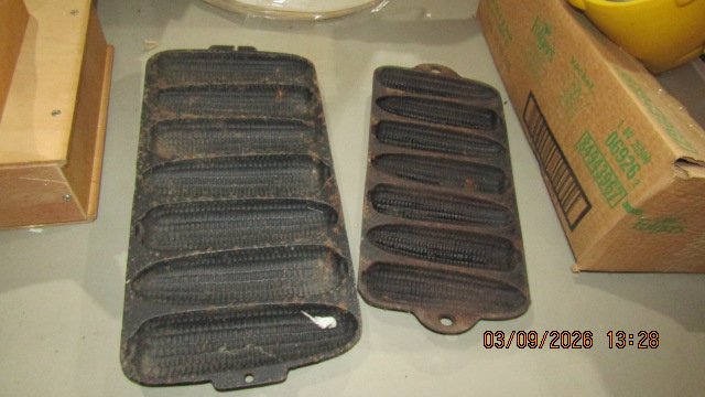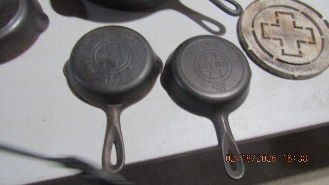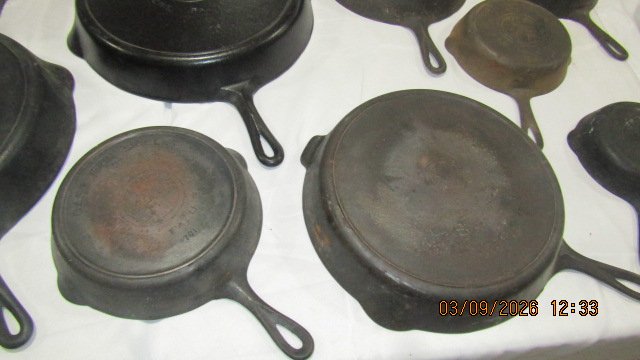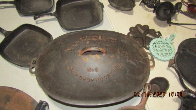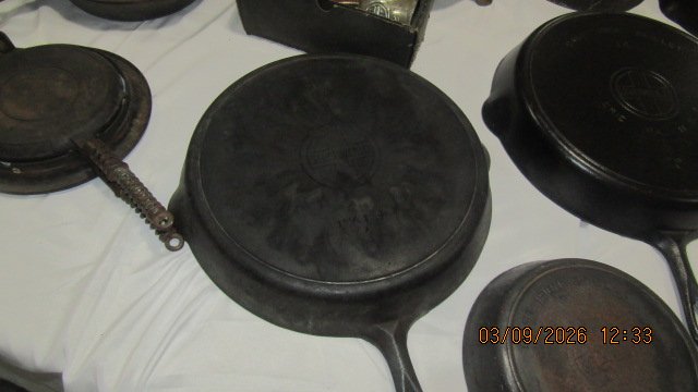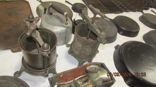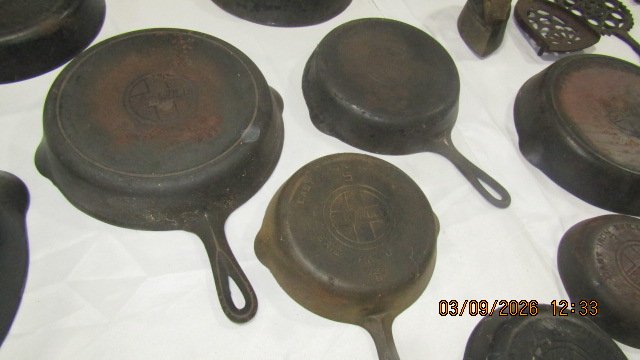 Wagner #9 Oval Drip Drop Roaster w/ Lid; Wagner #5 Oval Drip Drop Roaster w/ Lid; Griswold #5 Oval Dutch Oven w/ Lid; Wagner #0 Oval Roaster; Puritan Corn Stick; Corona Oval Skillet; Griswold #9 Griddle; Griswold #100 Hearts & Star Gem Pan; Ozark #3 Skillet; Mini Griswold Deep Paddy Bowl; GF Filley Mini Tea Kettle; Griswold #13 Oval Skillet; Griswold #0 Colonial Tea Kettle; Griswold #6 Dutch Oven w/ Lid; Griswold #8 Skillet – Marked on Handle 715; Bundt Pan; Wagner Bacon & Egg Skillet; Enterprise 2 Wheel Coffee Grinder; Griswold Trivets; Wagner #0 Mini Waffle Iron; Griswold #19 Gem Pan; Erie Mini Tea Kettle; Wagner #0 Dutch Oven; Griswold #0 Mini Tite Top Dutch Oven; Wagner #3 Scotch Bowl; Slant Griswold #10 Skillet w/ Ring; Griswold #10 Deep Skillet; Volrath #4 Skillet w/ Ring; Sidney Hollow Ware #9 Skillet; Griswold #8 Slant Skillet; 3 Wagner Chef Skillets – #9, #10 & #11; Griswold Heat Regulator; Griswold #2 Skillet; 2 Griswold #4 Skillets; Griswold #9 Skillet; 3 Wagner Square Skillets. Porcelain Atlas Sign; Two Sided White Rose Porcelain National Dealer Sign; Marlboro Sign; 2 Tin Coca-Cola Signs; Round Lions Sign; Stop Sign; Dazey Butter Churns; Crocks & Jugs; Several Oil Lamps; Lamp Parts; Lanterns, 2 #14 Griswold Skillets; 2 Large Griswold Griddles.