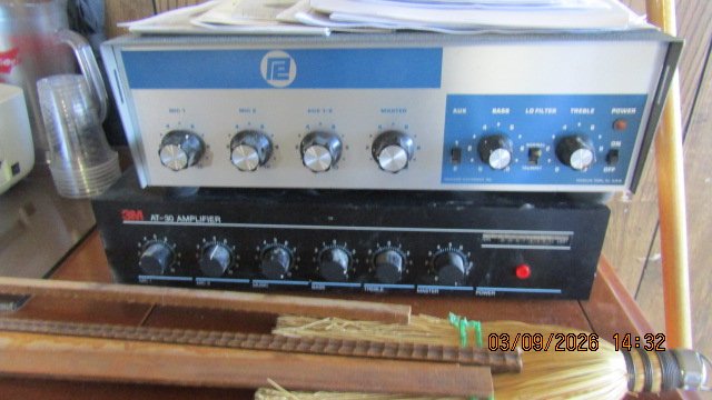 3M 30 Amp Amplifier, Process Electric (PE) Amplifier, Pioneer Cassette Player, Sharp Equalizer, RCA 8 Track Player, Pioneer Tuner, Several VCRs, Green Lee GT-65 Tester, Green Lee TS-1000 Tester, Fluke Meter, Speakers.
